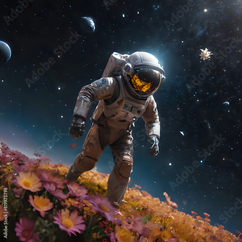 © Masum, Fototapeta premium astronaut in a space suit walking on a flower bed