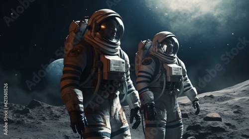 Fototapeta premium Astronaut in a spacesuit on an asteroid or planet moon in outer space. AI generated