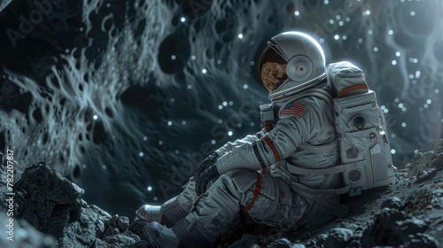 Fototapeta premium Astronaut in space suit sitting on a rock, suitable for science fiction themes