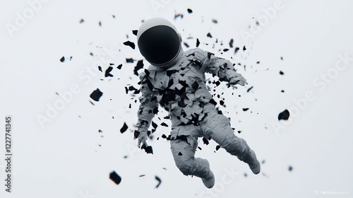 Fototapeta premium Astronaut in Space Surrounded by Fragmented Elements Against a Gray Background