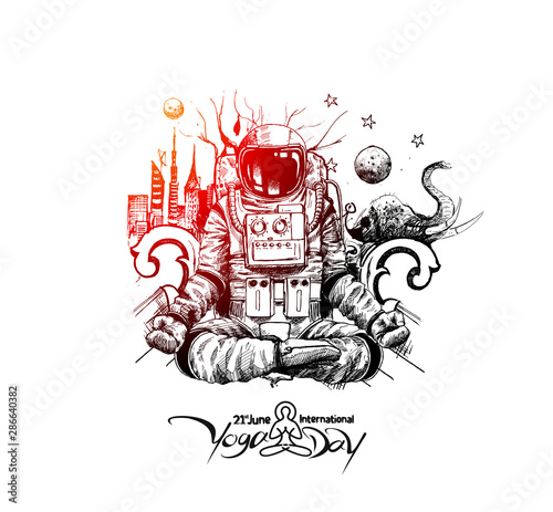 © Redshinestudio, Obraz premium Astronaut in spacesuit yoga gestures , Hand Drawn Sketch Vector illustration.