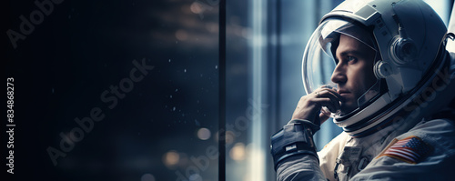 © iwaart, Fototapeta premium Astronaut Looking Out Window at Sunset