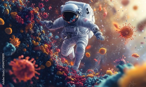 Fototapeta premium Astronaut navigating through colorful virus field.