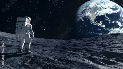 Obraz premium Astronaut Neil Armstrong, spacewalk on the Moon surface watching planet Earth from space.