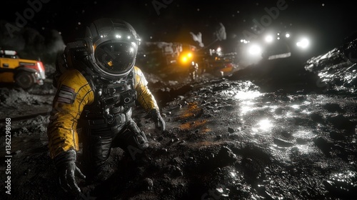 Fototapeta premium Astronaut on a dark, muddy lunar surface, near vehicles and other astronauts
