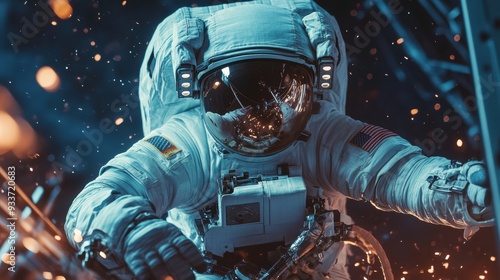 © PalaG, Fototapeta premium Astronaut on Spacewalk Repairing Damaged Satellite in Outer Space