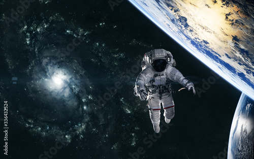© Aaron Alien, Obraz premium Astronaut, planets on background of spiral galaxy somewhere in deep space. Science fiction. Elements of this image furnished by NASA