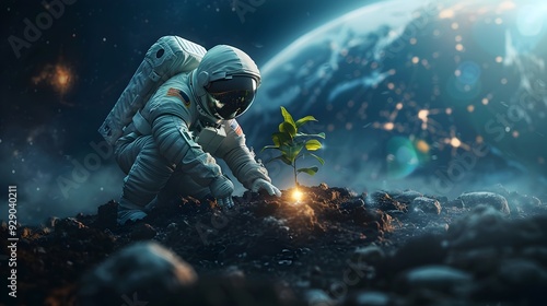 Fototapeta premium Astronaut Planting Tree on Earth from Space Environmental Initiative Concept