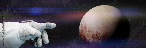 Naklejka premium astronaut pointing to dwarf planet Pluto