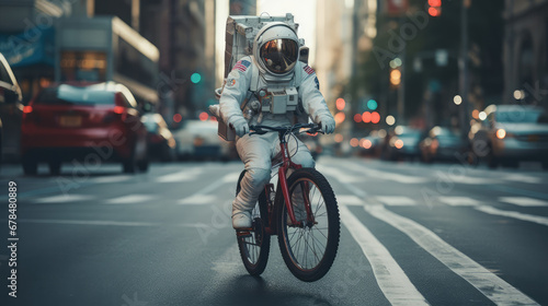 © akarawit, Obraz premium astronaut riding a bicycle in the city