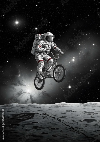 Fototapeta premium Astronaut riding BMX bike on the moon under galaxy sky