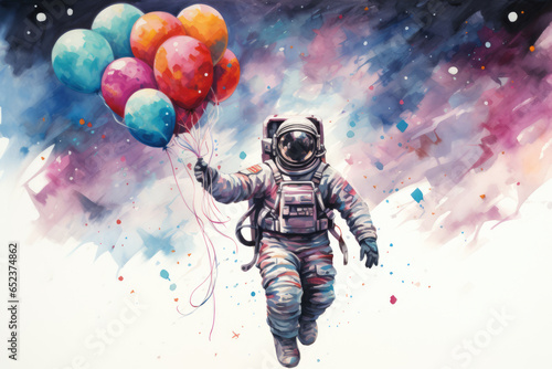 Fototapeta premium Astronaut spaceman flies on balloons in watercolor style