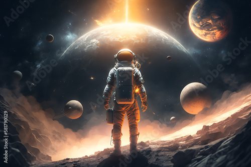 © kevin, Obraz premium Astronaut standing between planets in space, generative AI