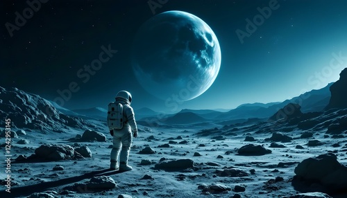 Obraz premium Astronaut standing on barren extraterrestrial surface with distant planet and...