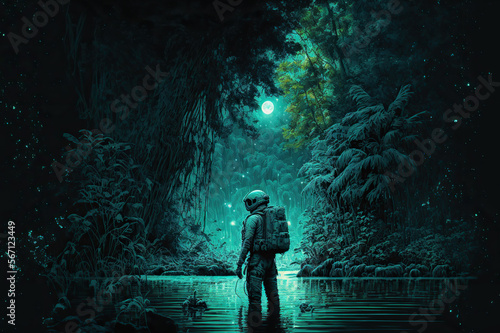 © alexkoral, Fototapeta premium astronaut stands in the water in the jungle under the starry night sky on a fantastic planet. Generative AI