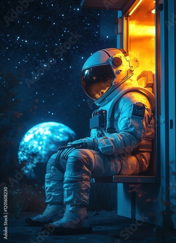 Fototapeta premium Astronaut waiting at a deserted bus stop under a starry sky