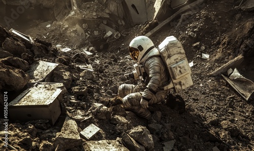 Fototapeta premium Astronaut walks through rubble in a destroyed city.