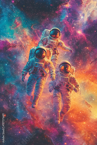 © Pavlinka, Fototapeta premium Astronauts exploring the vibrant colors of space amidst cosmic clouds and stars