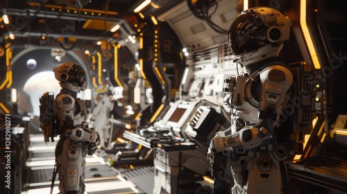 © faizan, Fototapeta premium Astronauts inside a Mars base, interacting with advanced robotic assistants