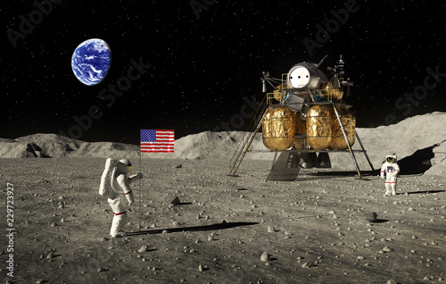 © 3dsculptor, Fototapeta premium Astronauts Set An American Flag On The Moon