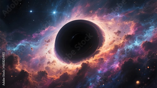 Obraz premium Astronomical Phenomenon: Black Hole Surrounded by Nebulae and Stars