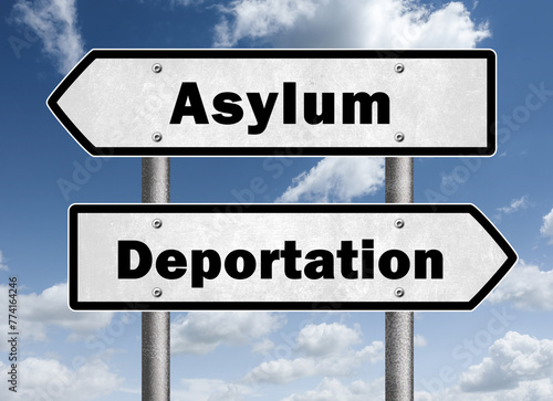 Obraz premium Asylum or Deportation - road sign message