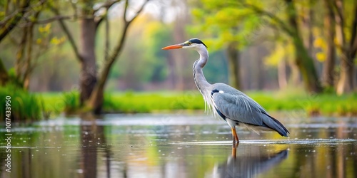 © Sarayuth, Fototapeta premium Asymmetrical grey heron standing in swamp area floodplain forest