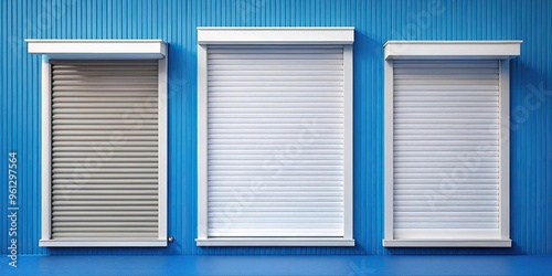 © methinee, Fototapeta premium Asymmetrical window roller shutters of different sizes on blue background