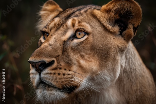 Fototapeta premium At Maasai Mara National Reserve, a lioness is drooling. Generative AI