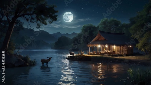Fototapeta premium at night in a village, with various kinds of animals, humans, river, mountain, moon, beautiful glow, raft nuances and beautiful mountain views, Generative AI