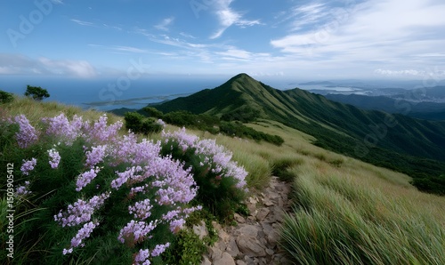 © simba kim, Fototapeta premium At night, you can see the starry sky and the starry moonlight, and purple and pink wildflowers bloom on both sides of the winding road leading to the mountains. Generative AI
