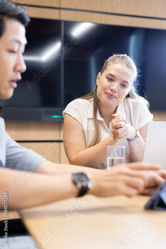 Fototapeta premium At office, multiracial colleagues collaborating in modern office with laptop