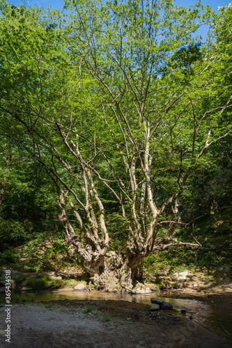 © Ali Tellioglu, Obraz premium At the edge of the forest, the old tree small stream.