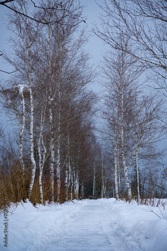 Fototapeta premium At Walchsee in Tyrol, Austria. Snow covered winter hiking trail lined with birch trees.