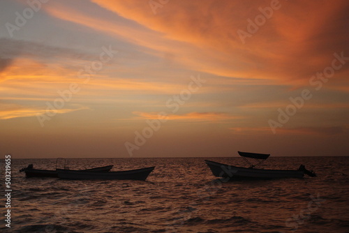 © Jen_polaroid, Obraz premium atardecer en el mar con botes