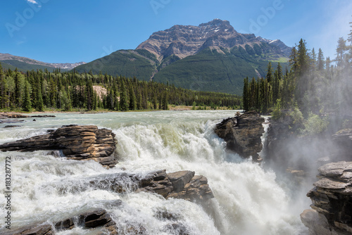 Obraz premium Athabasca Falls and pyramidal mountain in Jasper National Park, Alberta, Canada.