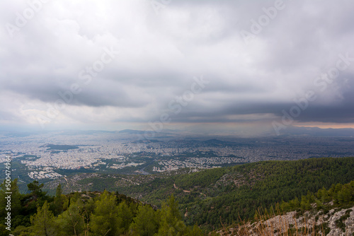 Naklejka premium Athens cloudy cityscape panorama from mount Hymettus