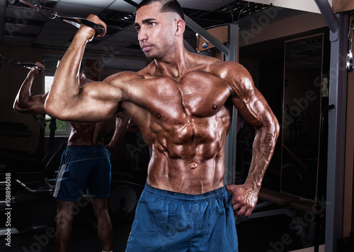Fototapeta premium Athlete muscular bodybuilder training on simulator in the gym