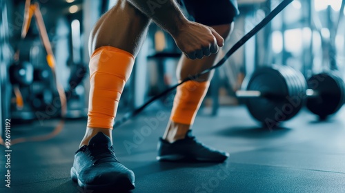 Fototapeta premium Athlete performing rehabilitation exercises with resistance bands, focused on strengthening the knee joint, modern gym background, knee joint recovery, rehabilitation