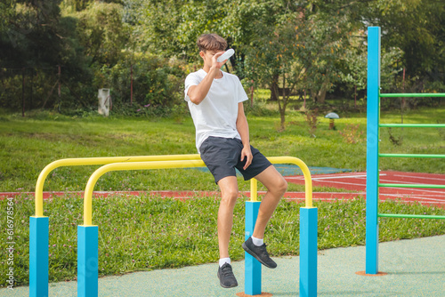 Fototapeta premium Athlete replenishes fluids after a hard workout on the workout field in the...