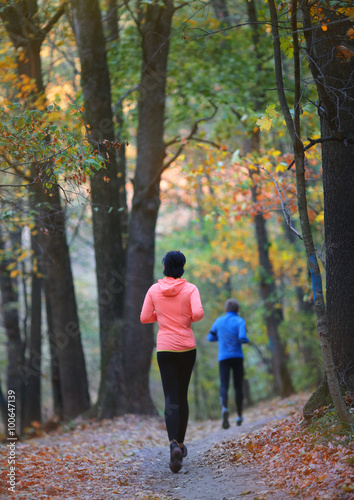 © Glebstock, Obraz premium Athlete runners feet running on the autumn forest road