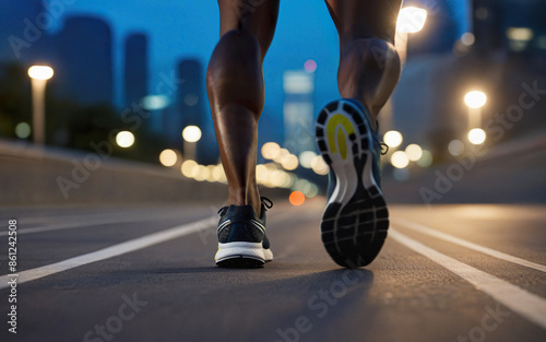 Fototapeta premium athlete running through the night city, close-up sneakers, lantern lights, training and active lifestyle, motion blur effect, soft focus
