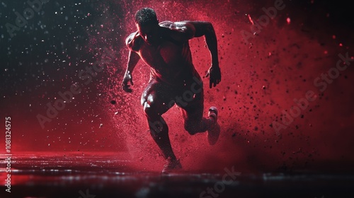 Naklejka premium Athlete sprints through a vibrant red mist, embodying power and...