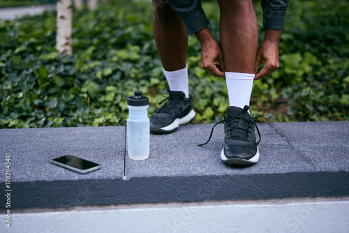 © bnenin, Fototapeta premium Athlete Tying Sneakers On Pavement With Water Bottle And Smartphone Nearby During Workout
