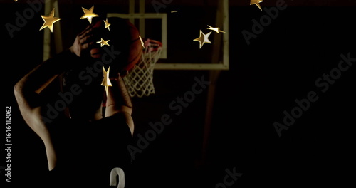 © vectorfusionart, Fototapeta premium Athlete wearing jersey 2 raising basketball overhead in gym, with hoop net, gold stars, copy space