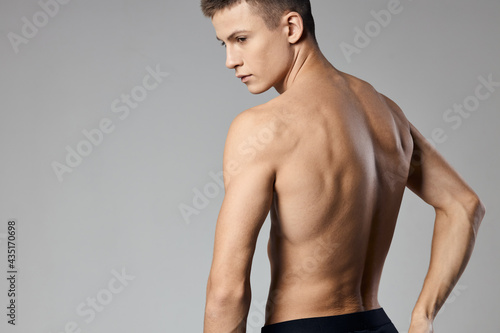 © SHOTPRIME STUDIO, Fototapeta premium athlete with pumped up muscles naked back gray background back view bodybuilder