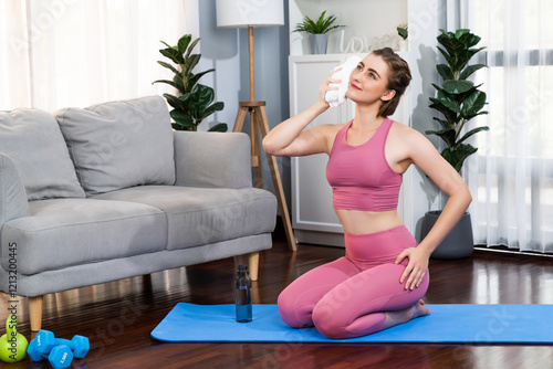 Fototapeta premium Athletic and sporty woman sitting, resting on fitness mat after finishing home body workout exercise session for fit physique and healthy sport lifestyle at home. Gaiety home exercise workout training