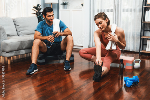 © InfiniteFlow, Obraz premium Athletic body and sporty young couple or workout buddy in sportswear warmup or resting after finishing in home workout exercise at gaiety home exercise and healthy lifestyle concept.