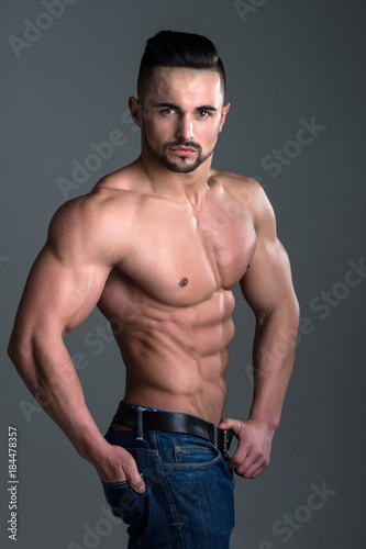 Fototapeta premium Athletic bodybuilder man on grey background.