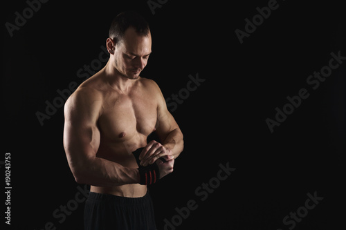 Fototapeta premium Athletic boxer wrapping hands with boxing bandage